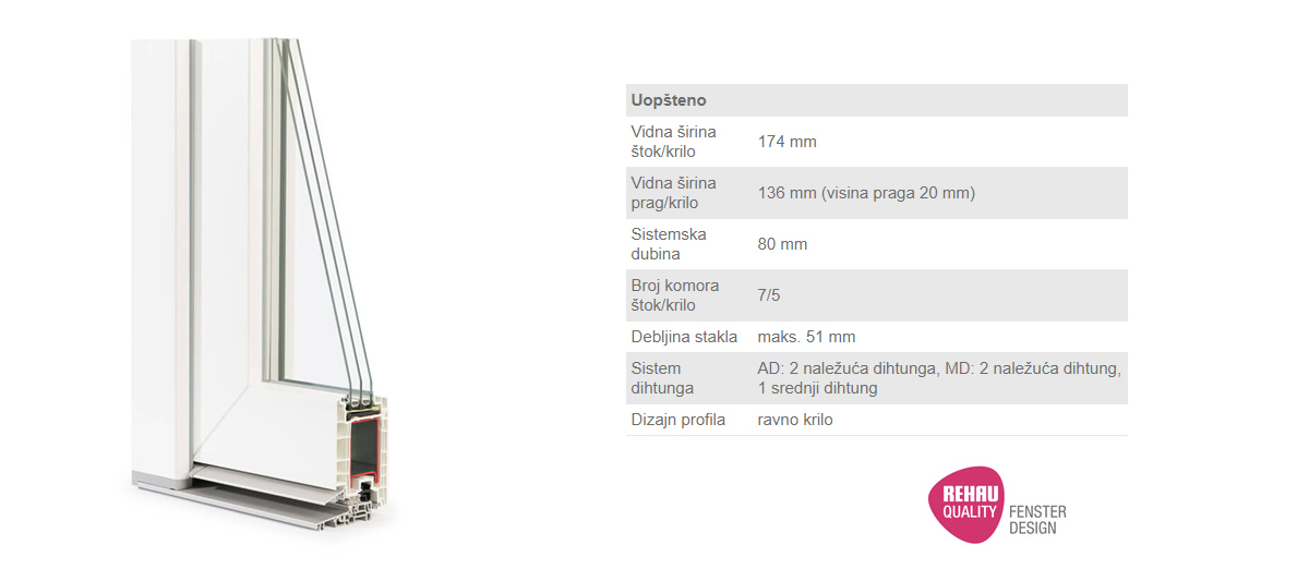 Profil sistemske dubine 80 mm Konstruisan za okove do klase otpornosti RC 3 SYNEGO nudi izuzetnu protivprovalnu zaštitu. Dobra termoizolacija, visoka zvučna zaštita, dugovečnost i široka paleta boja ubediće investitore sa najvišim zahtevima.
